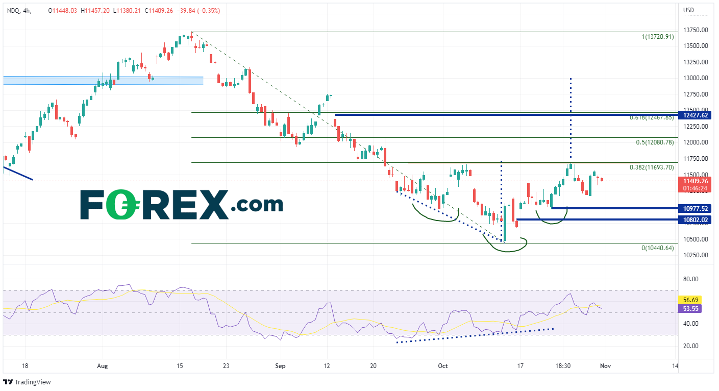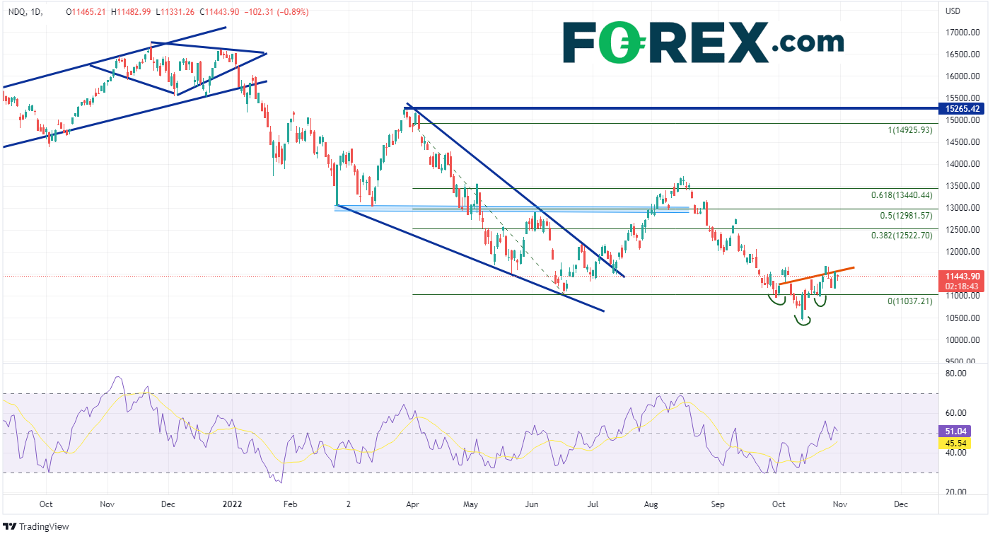 同时日线显示,纳指100在2021年11月21日创下有史以来最高点16764.86。之后,纳指100交投形成下降楔形形态,6月16日触底11311.05点。纳指100随后突破楔形形态,接着回落至3月29日高点(楔形顶点)至6月16日低点的61.8%回档位13720.91。在此之后,纳指100再度下探,并在10月13日创下年初至今最低点10440.64。随后,纳指100缓步爬升,于10月25日收复近期高点11681.85
