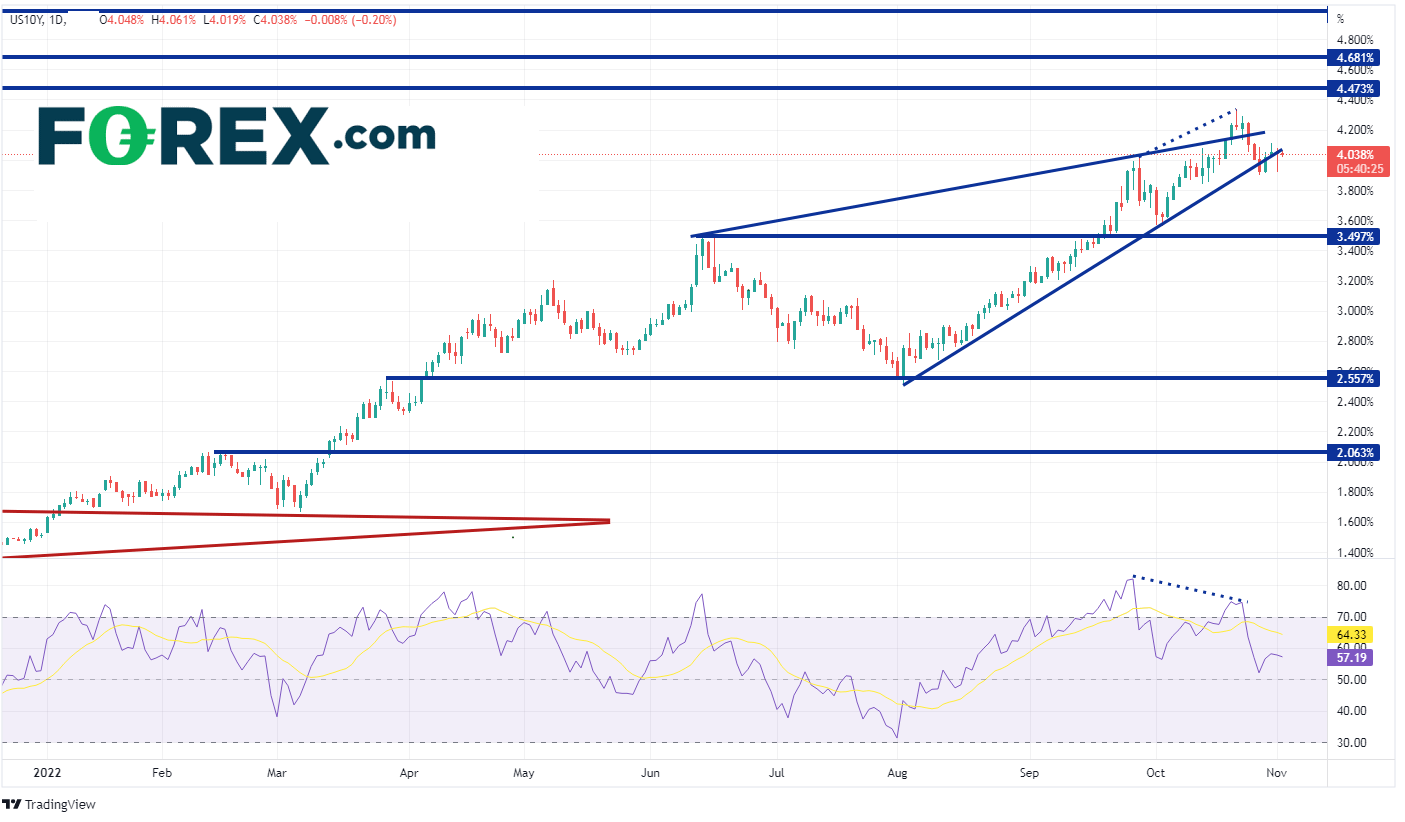 11月的FOMC会议临近,10年期美债收益率已经回落,并在4%左右震荡。如果关键收益率在FOMC会议后向上突破,首个阻力位在10月24日低点4.13%附近,然后是长期楔形的顶部趋势线4.23%附近。如果收益率继续走高并突破10月24日的高点4.335%,它可能会升至4.473%,即2007年11月以来的最高点位!然而,如果未能突破阻力位且10年收益率走低,则第一个支撑位在8月2日低点到10月21日高点区间的38.2%斐波纳契回撤位,既3.64%。在此下方,收益率可能跌至6月14日的高点3.497%,然后是前述区间的50%回撤位3.426%。
