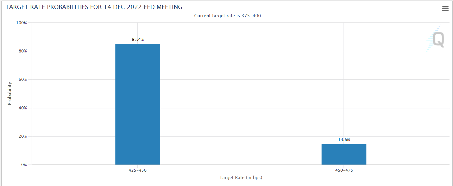 上周公布的美国10月CPI为7.7%,低于预期的8.0%。本周二上午公布了美国另一重要通胀数据PPI的10月表现。此前预期10月PPI将达到8.3%,但实际数值降至8%,远低于前值的8.4%。10月核心PPI为6.7%,低于同为7.2%的前值和预期值。11月的FOMC会议后,美联储讨论放缓联邦基金利率提高幅度的可能性。周一,美联储副主席布雷纳德表示:“可能很快放缓加息步伐。”但仅靠前两周的低通胀数据,就能让美联储把加息幅度从75个基点降至50个基点吗?根据芝商所“FedWatch”工具,市场认为12月14日议息会议加息50个基点的可能性为85.4%,而在上周CPI数据公布前,市场认为加息50个基点和75个基点的可能性大致五五分。