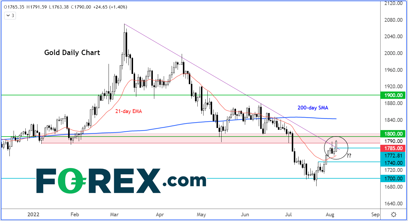 在讨论宏观面的影响之前,我们先来看金价日图显示其再度尝试击穿1785-1800区间的关键阻力位: