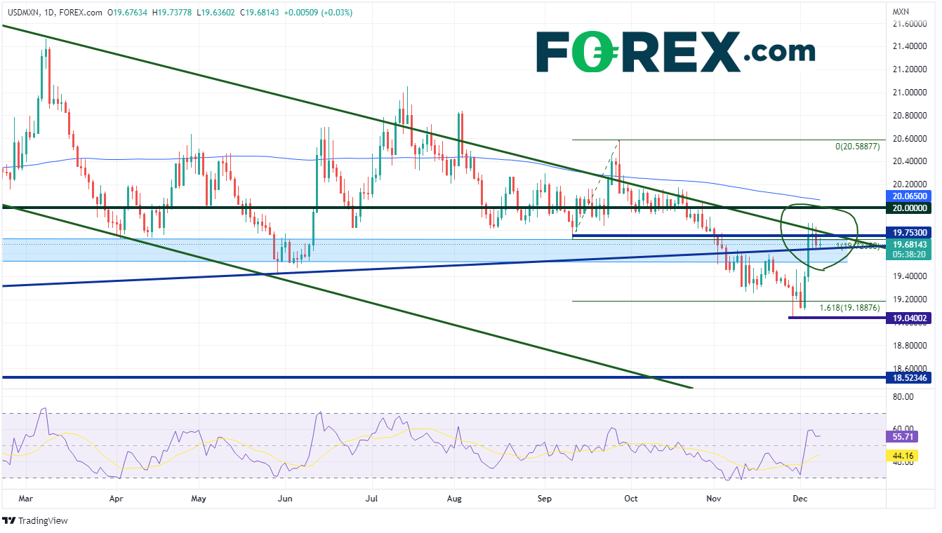 在日线图上,我们可以更清楚地看到前面提到的阻力区域是多么关键。美元/墨西哥比索自2020年4月以来一直走低(见周线图)。11月4日,该货币对终于跌破支撑区域底部19.5060附近。美元/墨西哥比索随后继续走低,直到价格短暂突破9月12日低点到9月28日高点区间的161.8%斐波那契扩展线19.1888。周五,在美国非农就业数据公布后,该货币对大幅走高,并在周一继续从低点19.1081升至近期高点19.8621。它会继续走高吗?