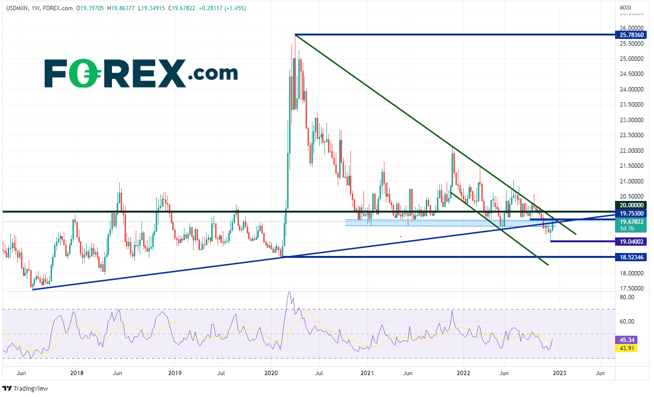 在周线图上,美元/墨西哥比索交投于关键区域。19.5060/19.7530区域是关键阻力区域,汇集了2017年7月以来的趋势线、2020年4月高点以来的下行趋势线和完全确立的阻力区(前支撑区)。