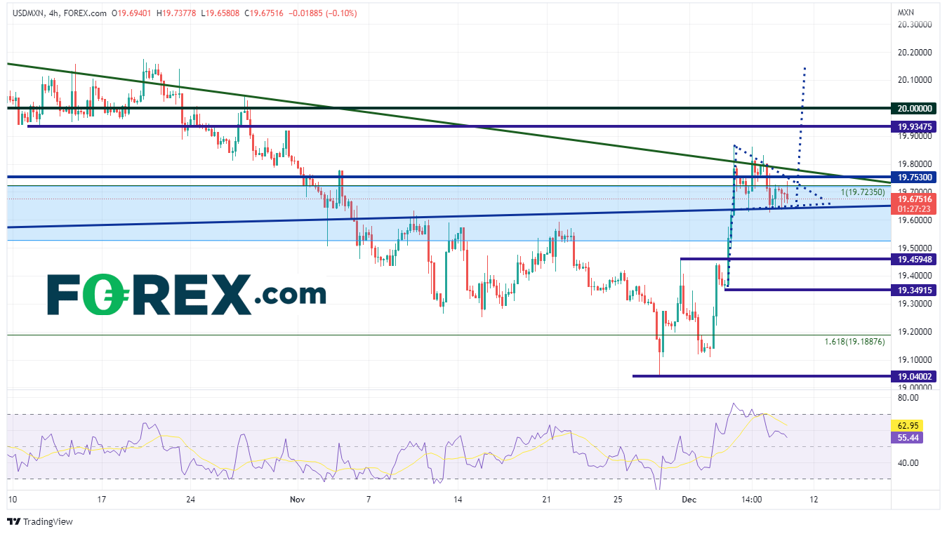 在240分钟图上,美元/墨西哥比索在阻力区域顶部附近形成三角旗形进行盘整。预计价格将沿着之前的方向上涨突破三角旗形。三角旗形的目标位是三角旗杆的高度加上突破点位,即20.1424附近。然而,如果价格能够突破上述长期阻力位,下一个阻力位于三角旗形顶部19.8621附近。在此上方,美元/墨西哥比索可能会升至10月以来的水平阻力位19.7530附近,然后是20.0000的整数心理阻力位。然而,如果长期阻力位未被突破,第一个支撑位在旗形底部(以及自2017年以来的趋势线)19.6272附近。在此下方,价格可能跌至水平支撑位19.4595,然后是12月5日以来的低点19.3492。