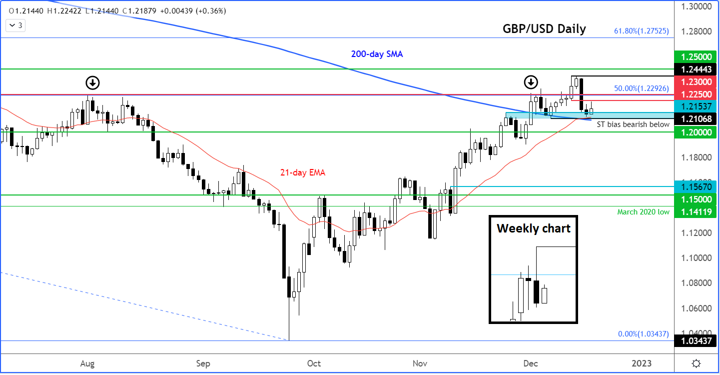 继上周央行的密集会议之后,英镑/美元本周下跌了约1%,不过从本周高点计算,跌幅更为明显——下跌2.4%或300点。由此产生了看跌的倒锤周K(见日线图上的插图)。鉴于这种潜在的反转发生在2021年高点至今的整个下跌区间的 50% 回撤位附近,它可能在未来几周发展为重大跌势。