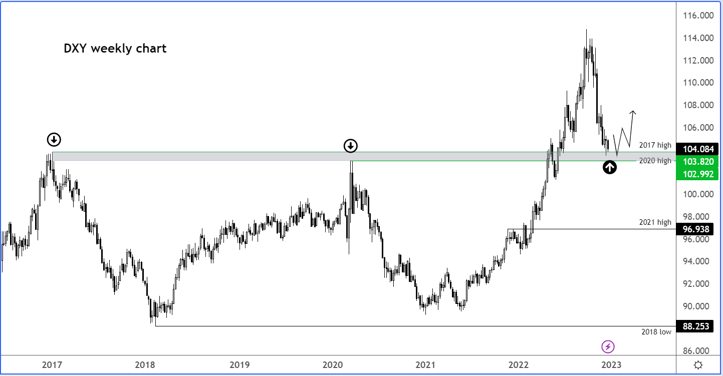 在讨论美元可能反弹的宏观原因之前,让我们快速浏览一下DXY的周线图: