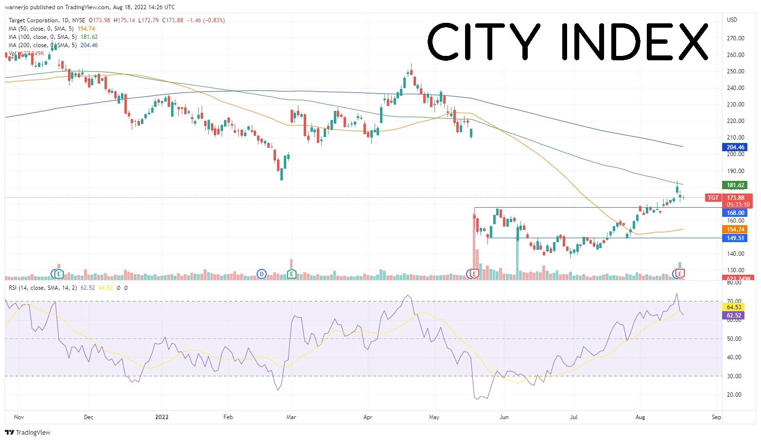 短线上行潜力受制于209。股价在5月令人失望的财报发布之前就落在209,之后同样暴跌。但塔吉特的处境可能更加艰难,因为RSI在股价测试100天均线时已跌入超卖区域,之后虽然成交量激增,股价还是丧失动能,第一目标可能在181.60。33家经纪商给出191.30的平均目标股价,认为上行潜力较为有限。