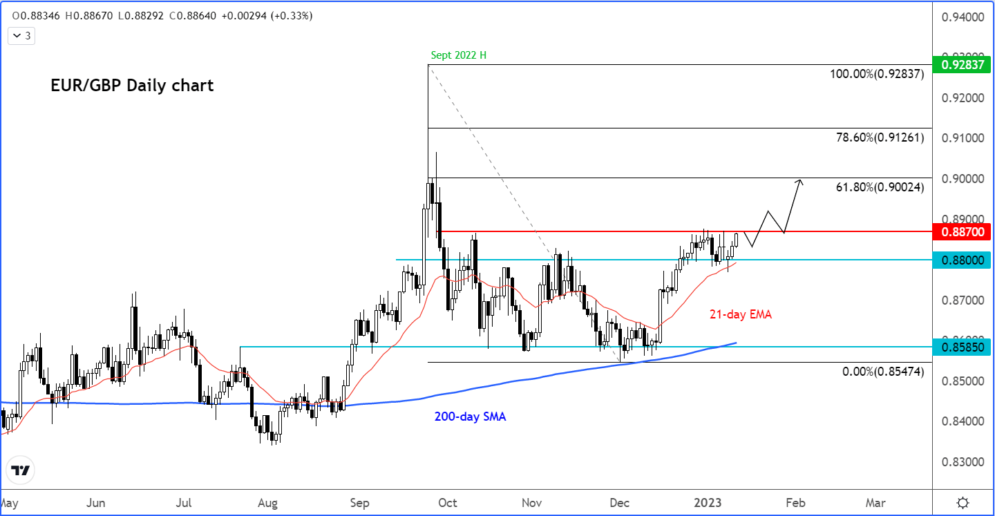 鉴于上述情况,投资者预计英国和欧元区货币政策之间的差距将缩小,欧元/英镑上涨。突破0.8870阻力位,同时也是61.8%斐波那契点位,会为接下来移至0.90整数位开路,。