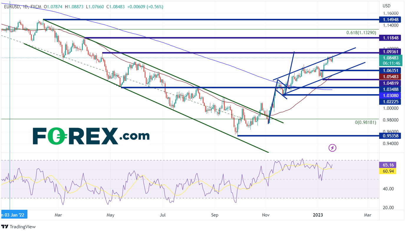 今天早些时候公布了日本央行政策和英国通胀,这时候最好看看欧元/美元,因为欧元区与它们没有太大的利害关系。在日线图上,欧元/美元触及2022年4月21日以来的最高点,美元的疲软助推该货币对走高。价格目前正在测试该通道的顶部趋势线1.0865附近,该趋势线始于2022年11月。如果美元继续走弱,该货币对将延续涨势。第一阻力位于4月21日的高点1.0936。在此之上,欧元/美元可能会移动到2022年3月31日的高点1.1185,然后是从2021年5月高点到2022年9月低点区间的61.8%斐波那契回撤位1.1329。但是,如果欧元/美元回调,第一支撑位是1月4日以来的高点1.0635。在此之下,价格可能测试50日移动平均线和通道底部趋势线的复合支撑位1.0548附近。下一支撑位是1月6日的低点1.0482。
