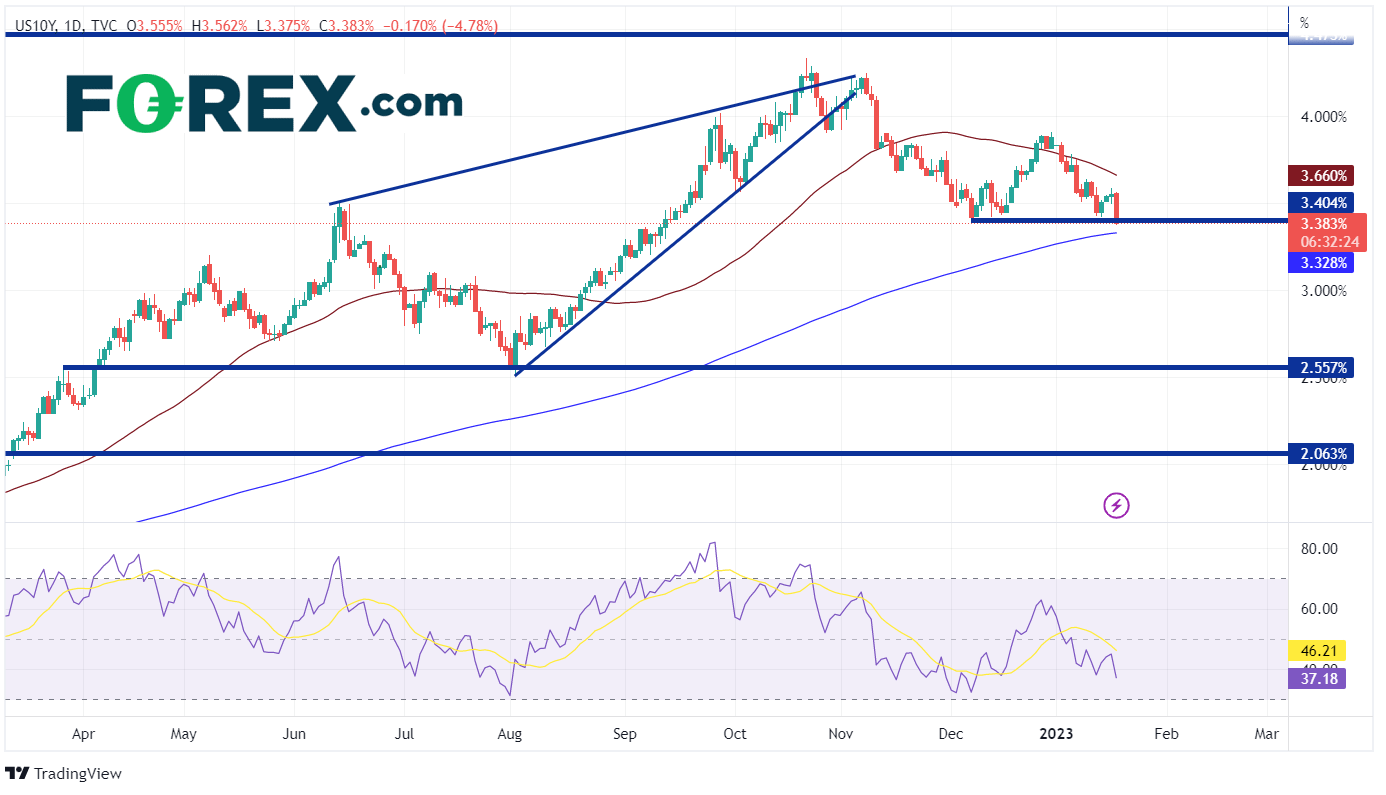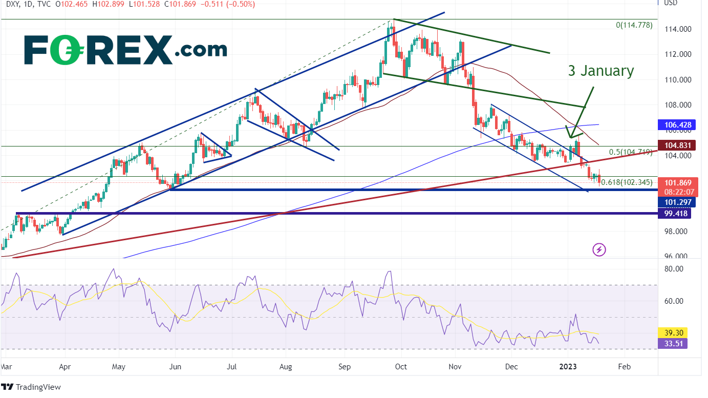 疲软的零售销售、通胀和制造业数据表明,美联储在2月1日的会议上将更加鸽派。这正在推动利率和美元走低。美国10年期国债收益率跌至2022年9月中旬以来的最低水平3.375%,而DXY收于2022年5月30日的支撑位101.30。