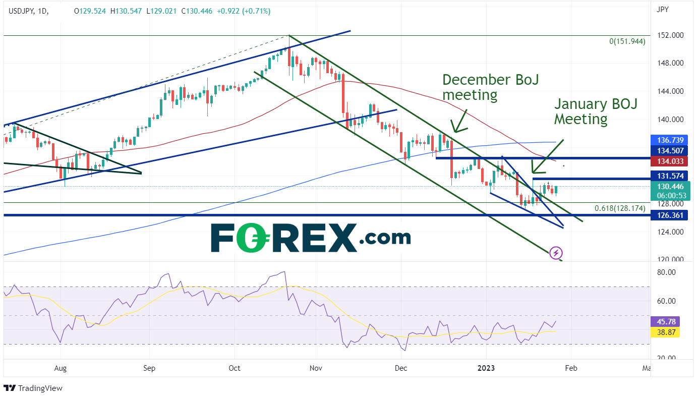 美元/日元自2022年10月21日创下2022年高点以来,一直在通道中稳步走低。该货币对跌至2022年低点到2022年高点区间的61.8%斐波那契回撤位128.17附近。2023年初,美元/日元开始在通道内形成下降楔形。该货币对在1月18日日本央行会议后开始横向冲破楔形和通道。自会议以来,价格一直在127.56和131.57之间振荡。