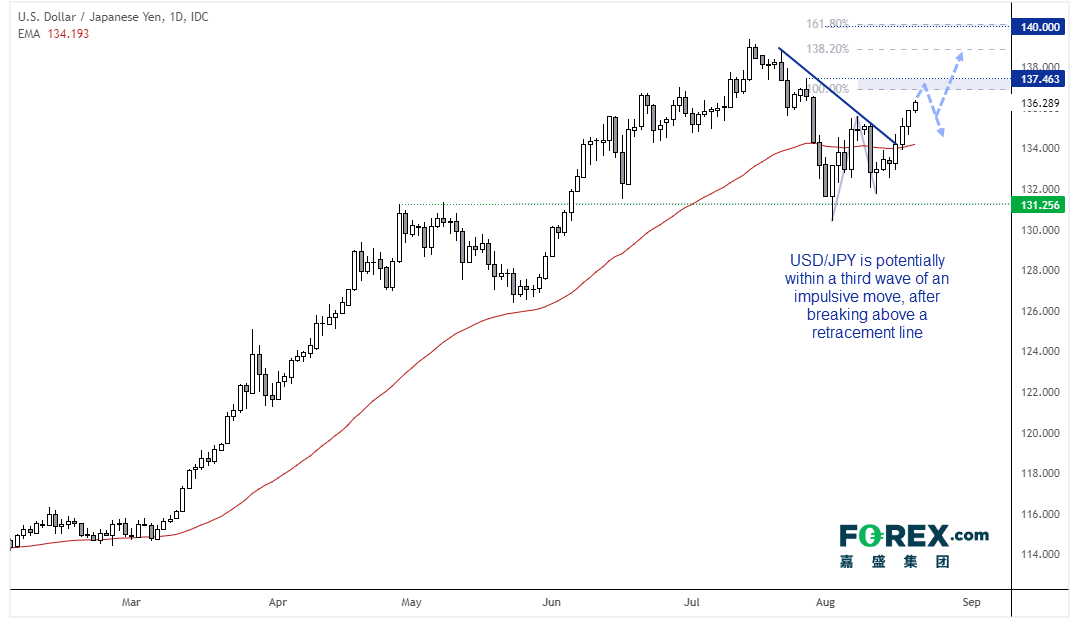 美元/日元日图仍处于上涨趋势中,最近站上了回档线,表明已重拾反弹行情。月初形成一个上抬的低点,现在可能处于第三浪推动浪。时间周期较低级别上的趋势结构同样看涨,价格有可能上攻137.46高点。我们留意在关键阻力区域,即138.2% 和 161.8%扩展位,回撤的风险。如果站上137.46高点,可能上看140整数关口下方不远处的前述价位。