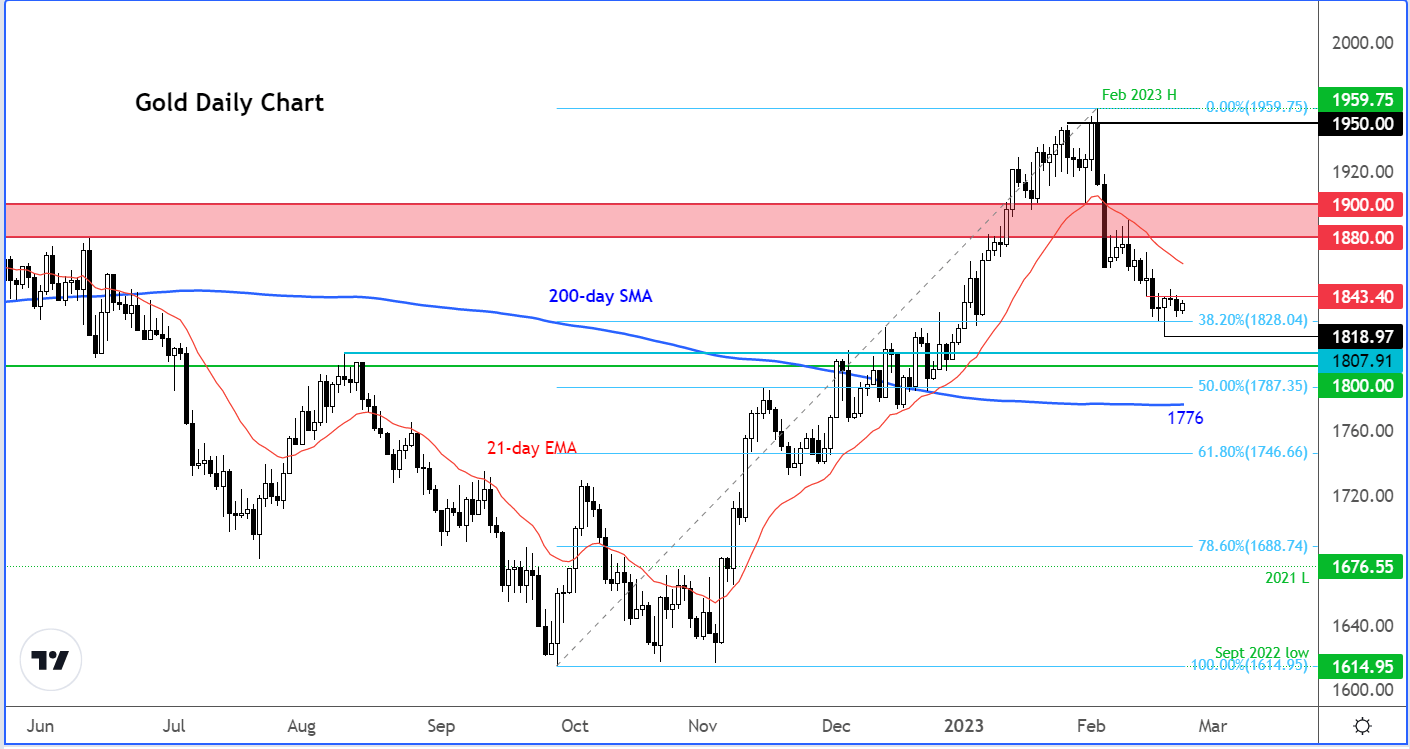 在FOMC会议纪要公布之前,黄金略微反弹,但现在谈论筑底还为时过早。这是因为自本月初以来,我们看到债券收益率重新走强,美联储和欧洲央行似乎都比市场预期的更鹰派。自这些央行会议以来,即将公布的数据大多好于预期,尤其是美国通胀和就业数据支持靠更多加息为经济降温的观点。但今天的FOMC会议纪要会与美联储最近的鹰派言论相一致吗?而对黄金交易员来说更重要的是,美元和收益率是否会进一步影响美联储的策略?