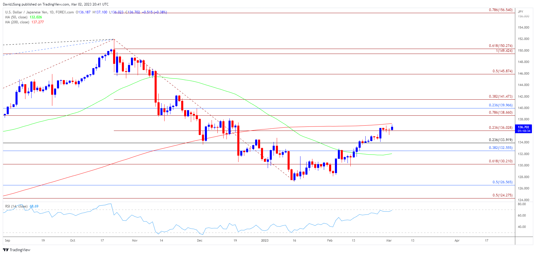 - 保持在70以上的RSI可能会伴随着美元/日元的进一步上涨,就像去年的价格走势一样,随着涨势加速,上破移动平均线将有机会挑战12月高点(138.18)。