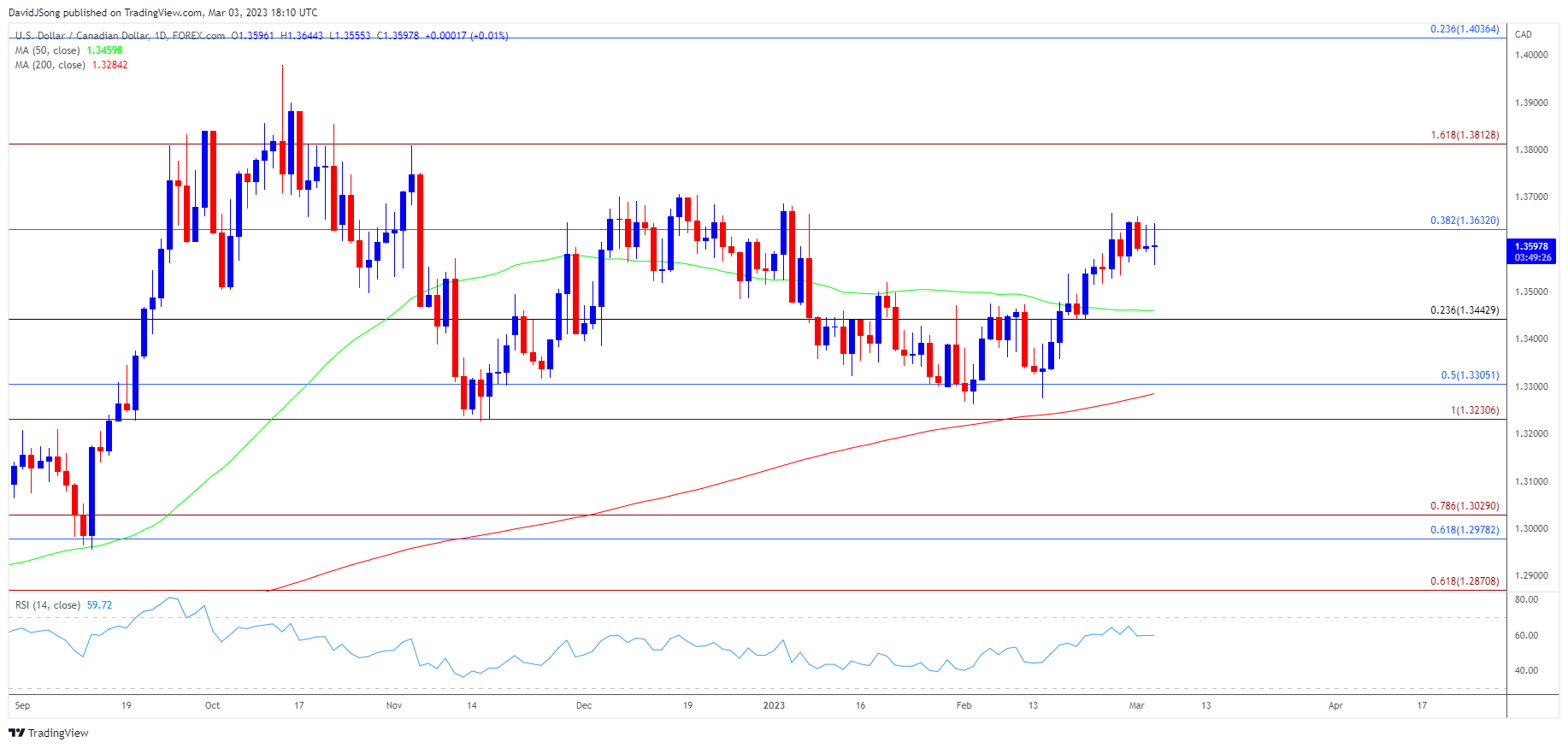 - 未能突破2月高点(1.3665)可能会推动美元/加元回落至50日均线(1.3462),因为相对强弱指数(RSI)保持在70以下,突破/收于1.3440(23.6%斐波那契回撤位)下方,则看向1.3310(50%斐波那契回撤位)。