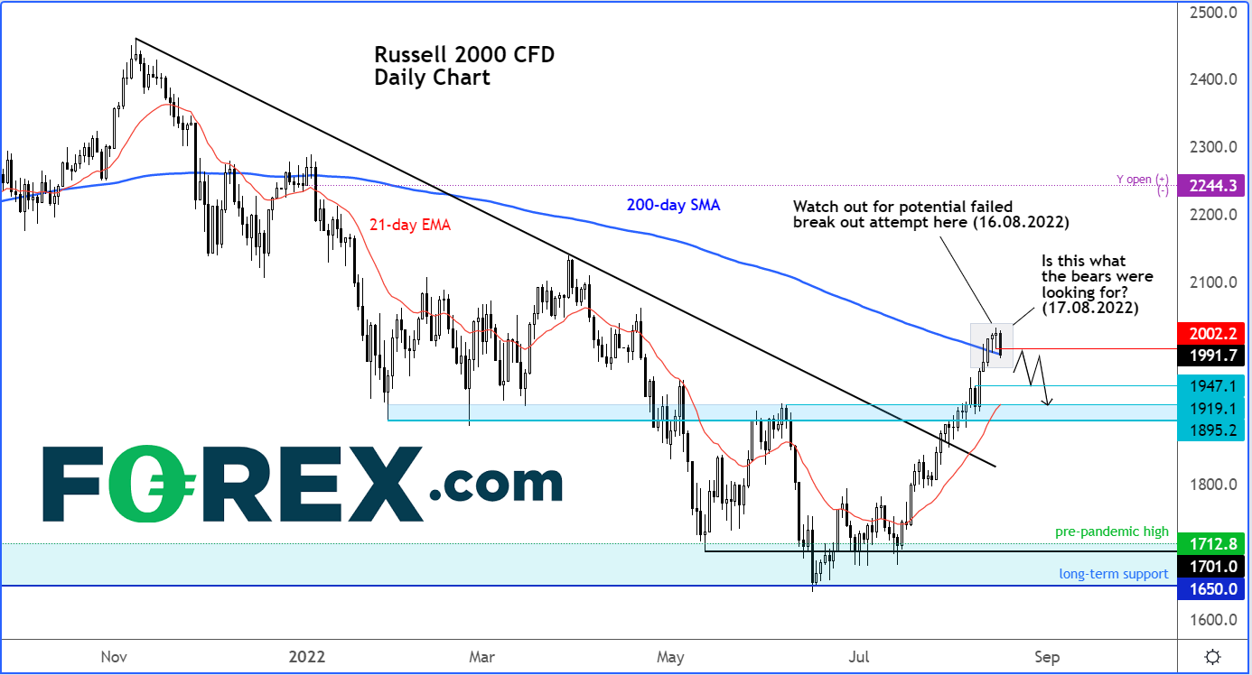 Russell和标普500指数一样值得关注,因其暂时未能守住200天均线,看起来是典型的假性突破。如果收于当前价位附近或下方,可能视为看跌。