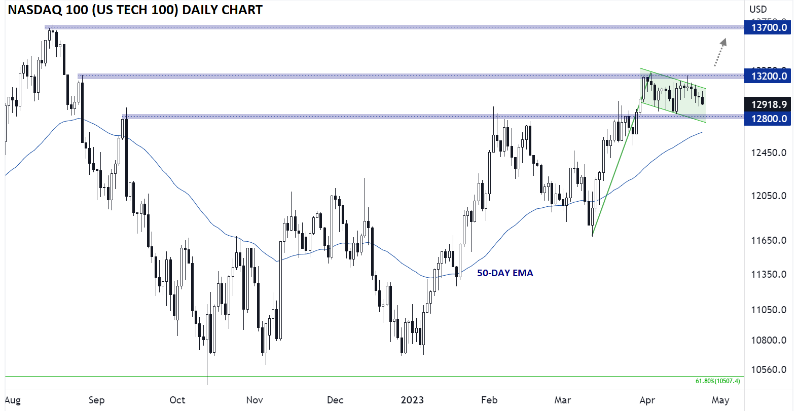 在META等“科技巨头”公布财报要点前,纳指100再度走低。从下图表看,纳指仍然位于看涨旗形形态内,价格逐渐从13,200点的阻力位回撤。