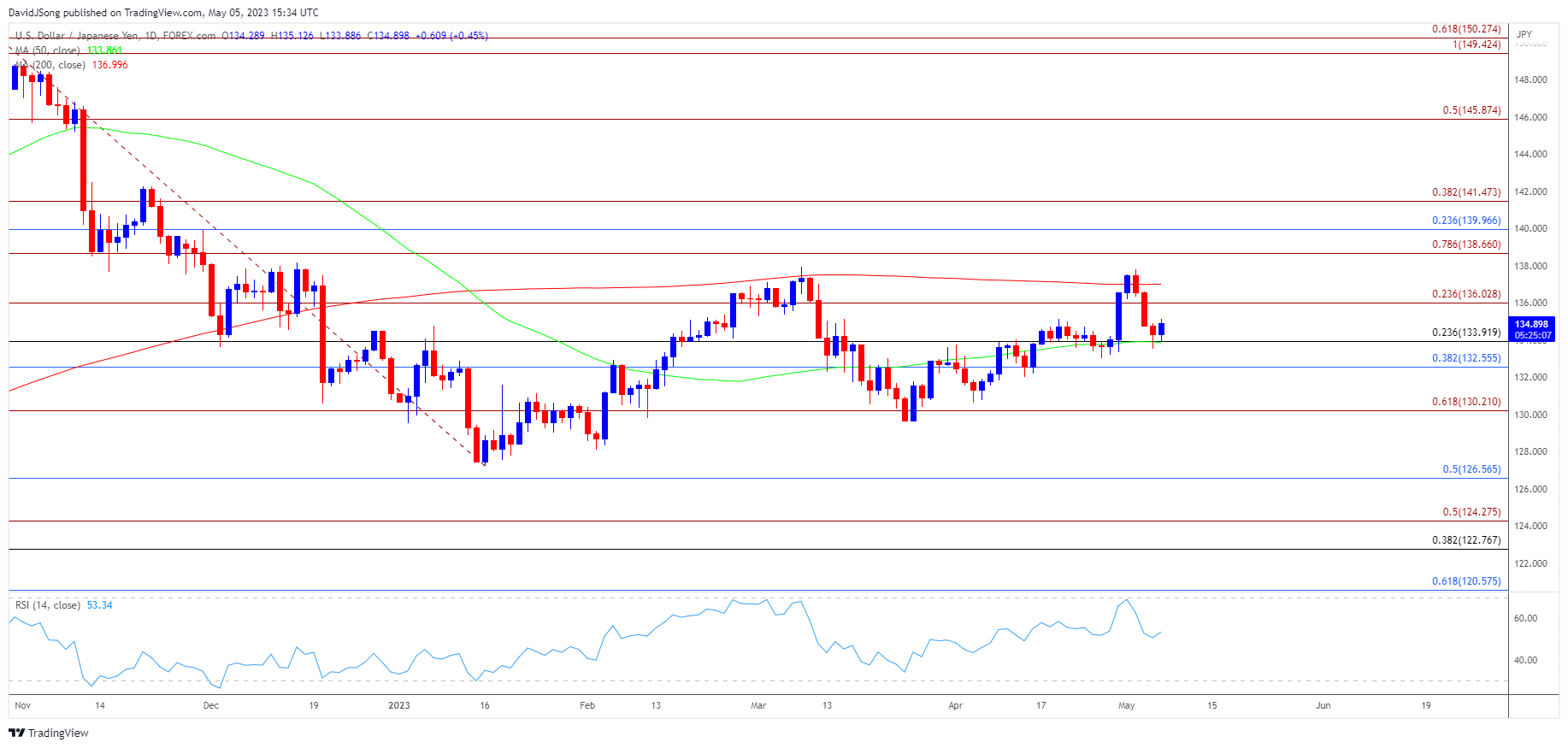美元/日元未能触及3月高点(137.91)并拐头向下,相对强弱指数(RSI)尝试突破70未果也反映了类似的动向。