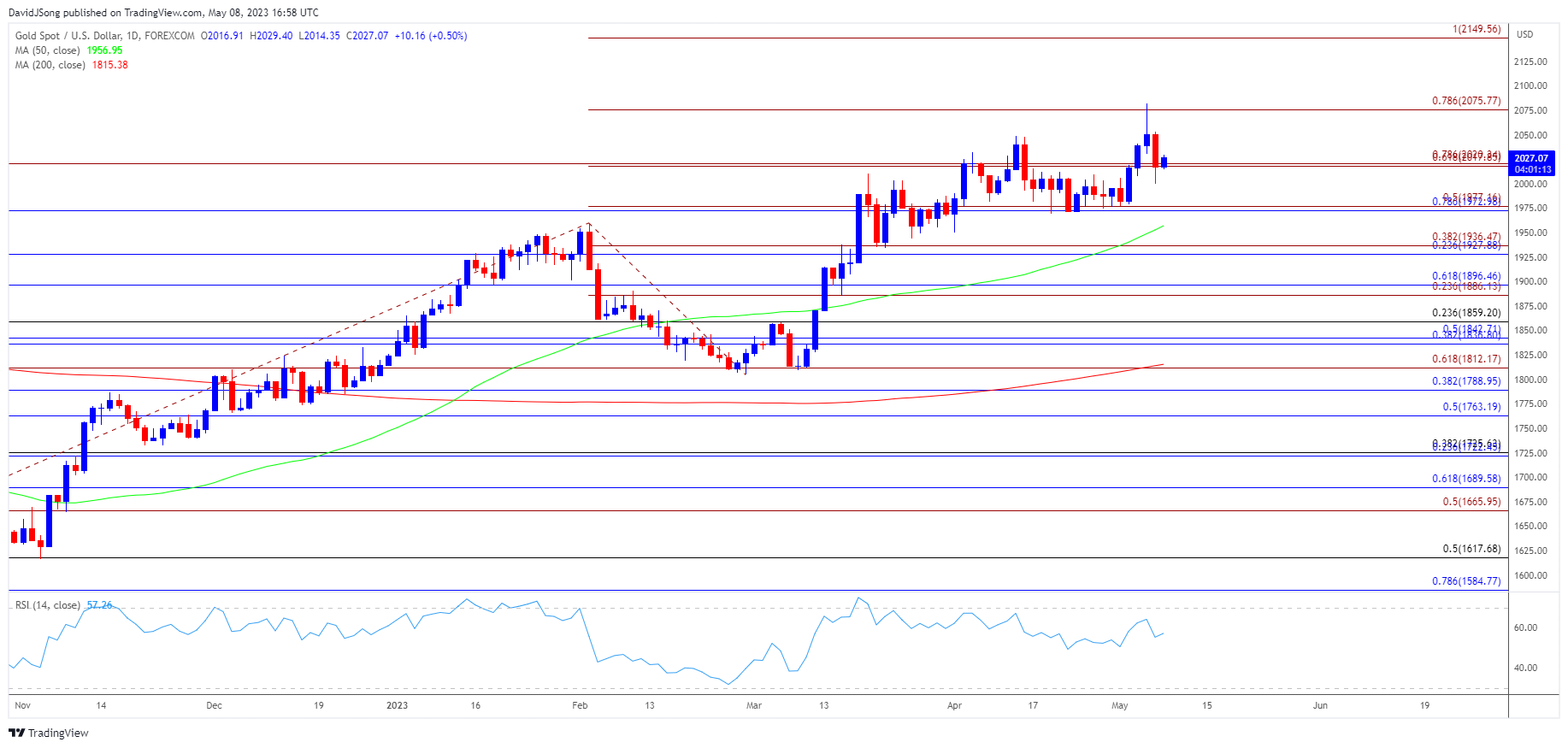 - 未能延续近期一系列更低的高点和低点可能会将金价推回至2075美元(78.6%斐波那契延伸线),突破月线高点(2082美元)将再次看向2150美元(100%斐波那契延伸线)。