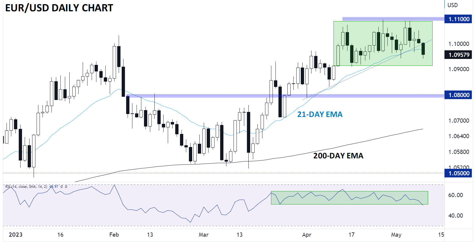 今年强势开局的欧元/美元现在看来正在失去动力。全球交易量最大的货币对在过去三周多次尝试却未能突破1.1100,今天汇率出现回落,跌破短期看涨趋势线和上升的21日均线。