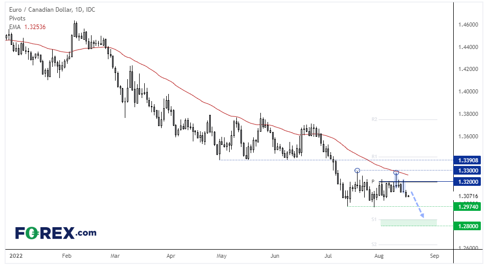 纵观加元货币对,最引人瞩目的是欧元/加元的潜在结构。该交叉盘日图仍处于下跌趋势中,并已在1.33构筑双顶,并且形成第二根看跌Pinbar。50天指数移动均线约束上档空间,并且价格现处于月图枢轴位下方,受制于月图中枢阻力位。合理推测可能跌至1.2800,期间月图第一中枢支撑位和1.2974低点可能构成支撑。