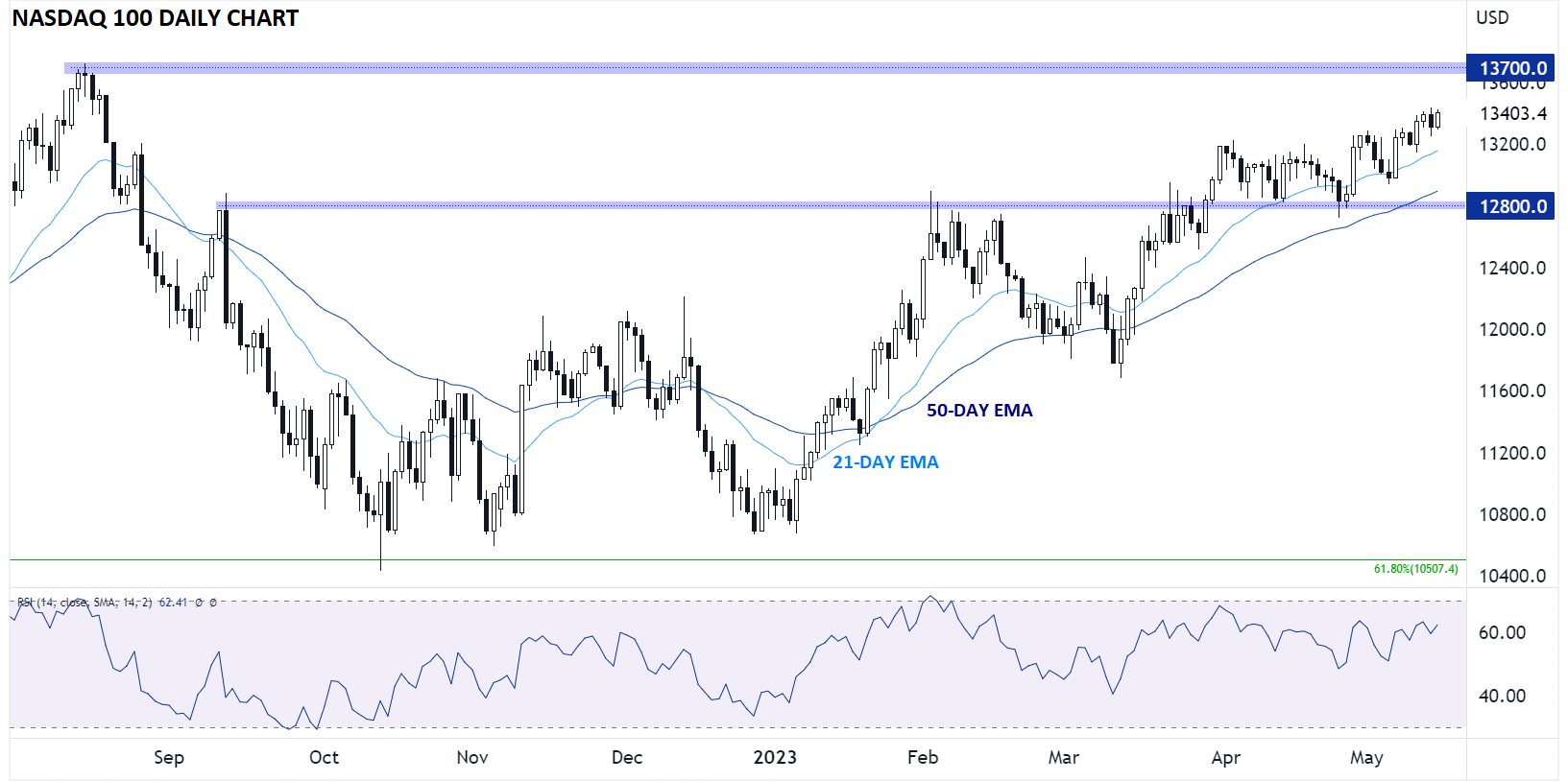 除了正在进行的债务上限谈判、美联储讲话、零售销售和零售商财报,本周仍有许多基本面事件值得关注,但从纯技术角度来看,纳斯达克100指数阻力最小的路径仍然是向上,在通往1年高点13,700附近的路上几乎没有重大阻力。目前,只有拐头向下跌至50日均线下方和前阻力转支撑位12,800附近,才可能瓦解当前的涨势。