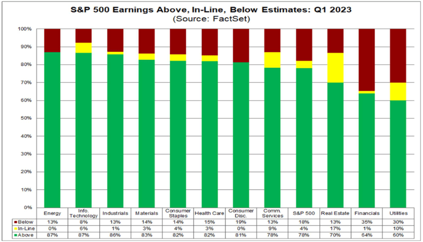 根据FactSet的财报分析专业人士的数据,标准普尔500指数92%的公司财报已公布,78%的公司好于盈利预期,高于73%的10年平均水平,75%的标准普尔500指数公司超过了分析师的收入预期(10年平均水平为63%)。这些成绩除去金融业后更为出色,毕竟金融业不仅受到了贷款条件收紧和资金成本上升的影响,还面临持续的“银行存款流失”。