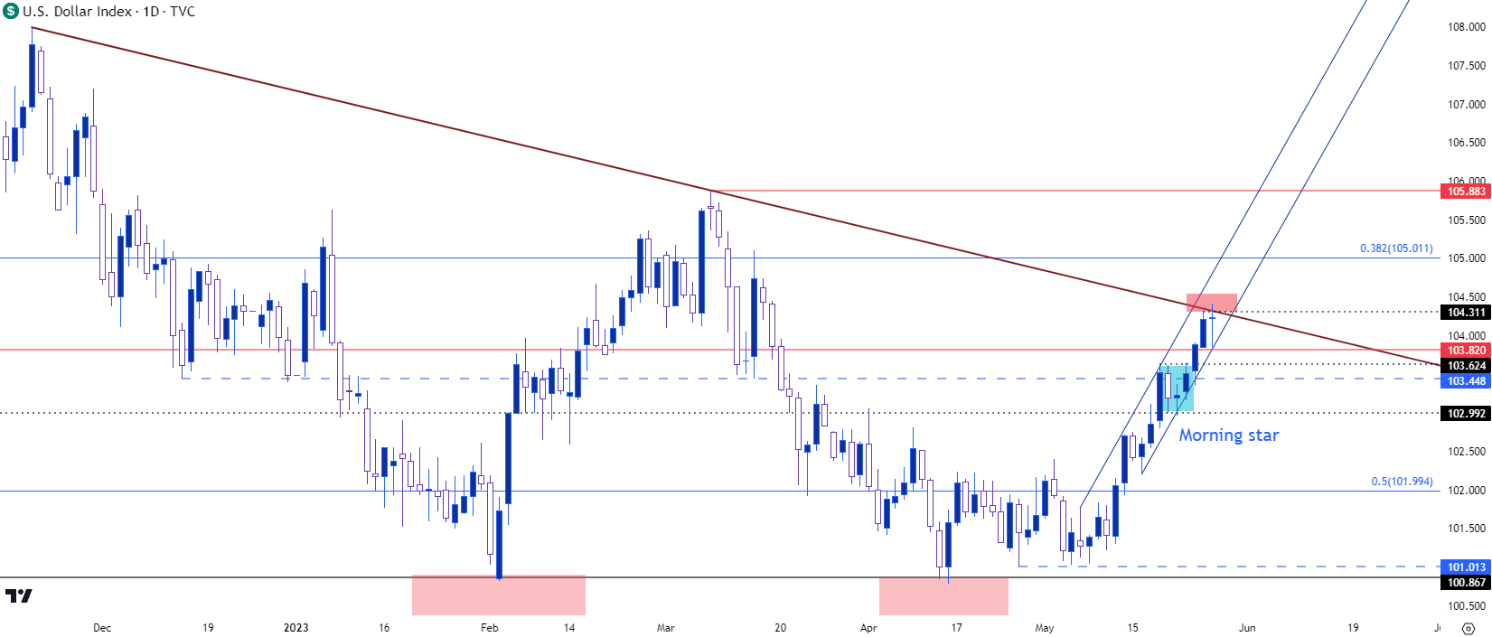 目前距离日线落定还有几个小时,此时它显示为十字星,此前本周已连续形成四根看涨日线,而周三和周四更是大幅走高。周一收于103.00的十字星仍然值得注意,因为这标志着晨星形态的底部,继而促成了周三和周四的暴涨。