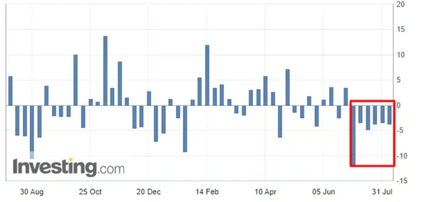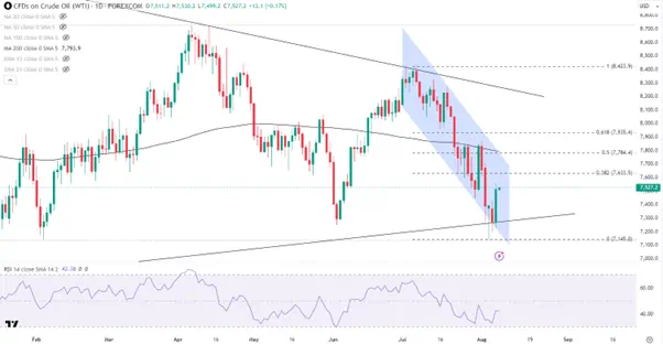 继7月31日后,WTI原油再次形成强劲的看涨吞噬形态,RSI指标连续两次触底并形成背离,油价这一次能真正形成反弹走势?
