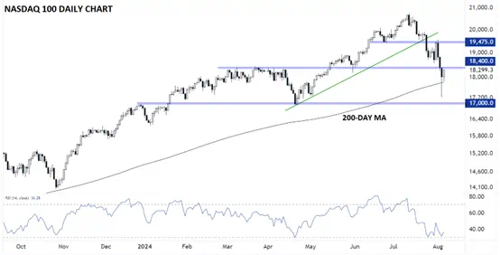 从上图来看,纳斯达克100指数仍低于之前的支撑/阻力位18,400点这一关键价位,只要价格仍低于这一区域,短期多头就会犹豫是否要主动返回市场买入。不过,对长期多头来说,好消息是NDX的确守在了200天均线上方,这标志着(截止至当前)自2023年初纳斯达克100指数上升趋势开始以来,第三次成功测试这一重要的趋势风向标。