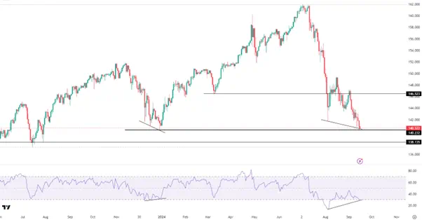 RSI指标的超卖和背离或许意味着价格在138-140区域有止跌的可能,但小幅的反弹可能再次遭遇空头的压制,上方关注144以及146.50等位置。