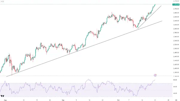 黄金在不同级别上的确都存在超买迹象,但近期的多头情绪也的确足够亢奋,这令金价正在不断刷新历史新高。若能维持在2690-2704区域即趋势线上方,短线有望维持强势。