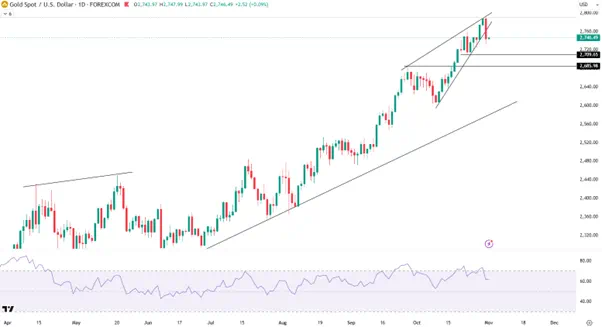 金价周四的下挫再次突显出和RSI指标的背离问题以及潜在的回调风险。若金价无法回到2755上方延续上升走势,恐下探至2718一线以及更下方的2685附近。