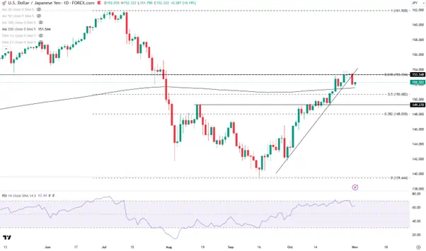因此若今晚的非农数据亮眼,有望再次拉大美日两国利差从而刺激美元指数和USDJPY回升。61.8%回调位153.33是多头必须突破的位置。