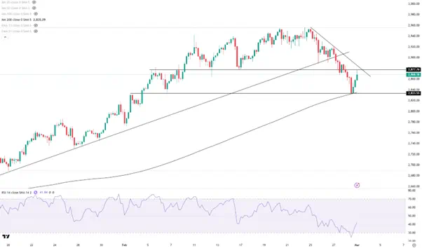 技术指标的超卖和避险情绪可能共同帮助金价在本周初展开一定程度的反弹,上方关注2880附近的潜在压力。从周线和日线结构来看,空头似乎已经占据相对上峰,反弹失败后或再次考验上周低点2833一线。