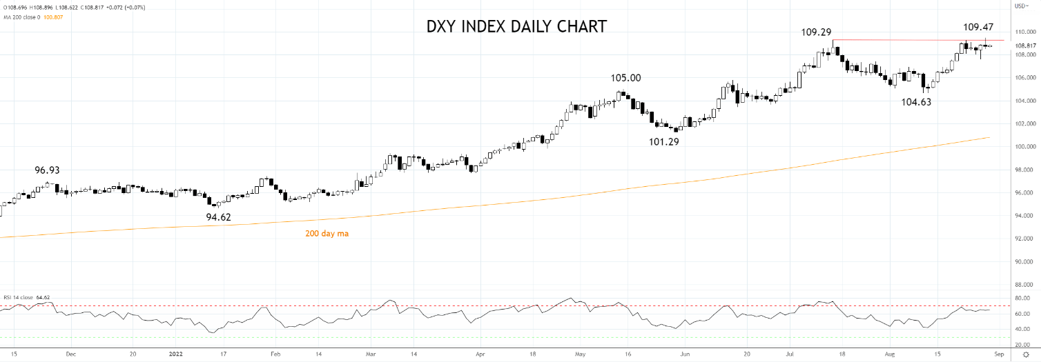 美国2年期债券收益率最高上涨10个基点,至3.48%,反映了9月加息75个基点的可能性上升,并且助涨了美元指数,使其报在2002年9月以来最高点109.47。