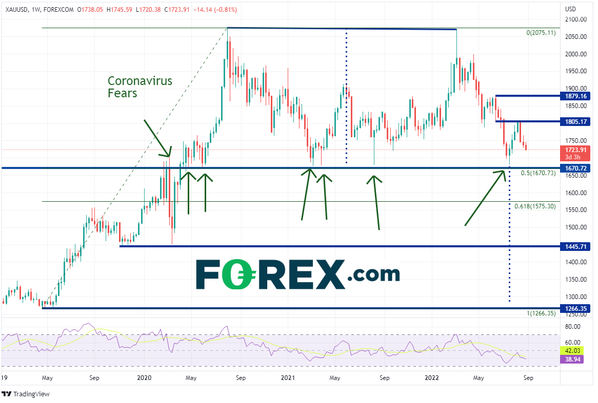 受到加息可能性的打击,现货黄金/美元不断走低。在鲍威尔上周五讲话发布之后,金价自1802.52高位下跌至目前的1720.38附近,后市会继续下跌吗?从日图看,1670一直是重要的支撑位,2020年4月以来大约6次帮助价格反弹。金价守于其上时,两次最高摸至2075附近,有可能形成了双顶形态,其颈线在1670附近,那也是2019年4月低点到2020年8月3日高点行情的50%回档位。如果最终下破该大关,价格可能完成双顶形态,剑指1285,即2019年4月低点附近。