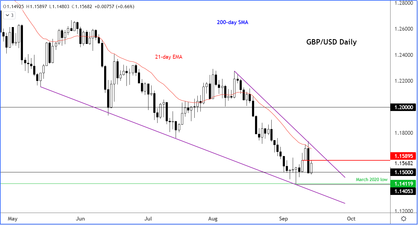 此文发稿时,英镑/美元在测试周一以来低点1.1590一线,那是前支撑位,在周二告破后或转变为阻力。如果空头在此处入场,或推动价格跌至1.15。如果进一步下跌,可能下看于上周遭到考验的、略高于1.14的2020年3月低点。