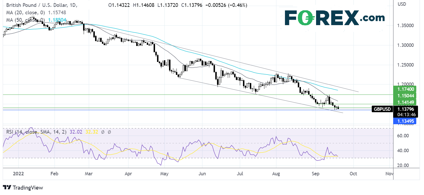 英镑/美元目前交投于数月下降趋势线,处于数十年低点1.14下方,而且RSI支持价格扩大下行。空头需要下破周图低点1.1350才有机会跌至1.13支撑位,而多头的目标是攻克9月7日低点1.1405后上看1.15整数位。