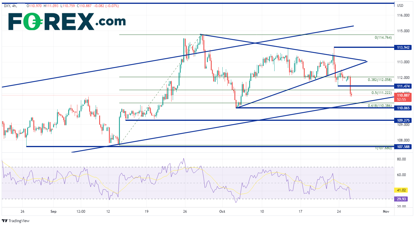 从4小时图来看,正如上文所述,美元指数正在测试200天移动平均线(见日线图),突破9月13日低点至9月28日高点的50%回档位,落在111.22。如果价格持续走低,长期通道下轨将与61.8%回档位将在110.39附近交汇,形成第一个支撑位区间,下一支撑位则在10月4日低点110.07。第三个支撑位则落在9月14日低点109.28。然而,如果美元指数坚挺并继续攀升,则第一个阻力位将在10月24日低点111.41形成。继续向上,指数可能分别向对称三角形两条轨线上的112.70和113.25波动,然后上探113.94(10月21日高点)。
